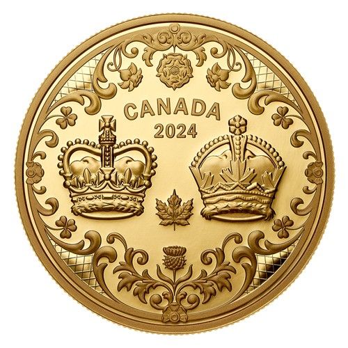 Опис: На реверсі монети зображено геральдичне зображення корони Святого Едварда — історичного головного убору, який носив Його Величність король Карл III під час коронації 6 травня 2023 року — зліва, а праворуч — канадську королівську корону. Об'єднані кленовим листом, що символізує Канаду, дві королівські корони оточені емблемами Сполученого Королівства — трилисником для Ірландії, чортополохом для Шотландії, трояндою Тюдорів для Англії та нарцисом для Уельсу — переплетеними з листям аканта.