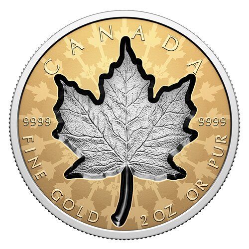 Опис: На реверсі нашої монети зображено дизайн золотого кленового листка (GML) Вальтера Отта. Викарбуваний у вигляді втиску, знаковий лист цукрового клена покритий платиною і досягає глибини 1,5 міліметра. За ним поле з візерунком «кленовий вибух» містить тонкий натяк на 45-ту річницю GML (1979-2024) у вигляді мікрогравіювання «45» на листі, що утворюють центральне кільце.