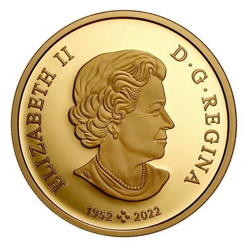 Опис: Голова королеви Єлизавети II у віці 77 років, без головного убору, в намисті та сережках, обернена вправо. Зображення супроводжується спеціальним маркуванням, що складається з подвійних дат «1952» та «2022», розділених чотирма перлинами, що символізують чотири зображення, які прикрашали канадські монети під час правління Єлизавети II.
