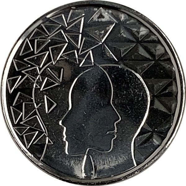 Опис: Людина ліворуч відкрито розповідає про свої труднощі, а людина праворуч активно слухає. Трикутники позначають стан благополуччя кожної людини, причому неорганізовані трикутники символізують роздробленість думок та/або стан дистресу; організований візерунок вказує на здоровіший стан розуму, а відсутні трикутники нагадують нам, що не існує такого поняття, як «ідеальне» психічне здоров'я.