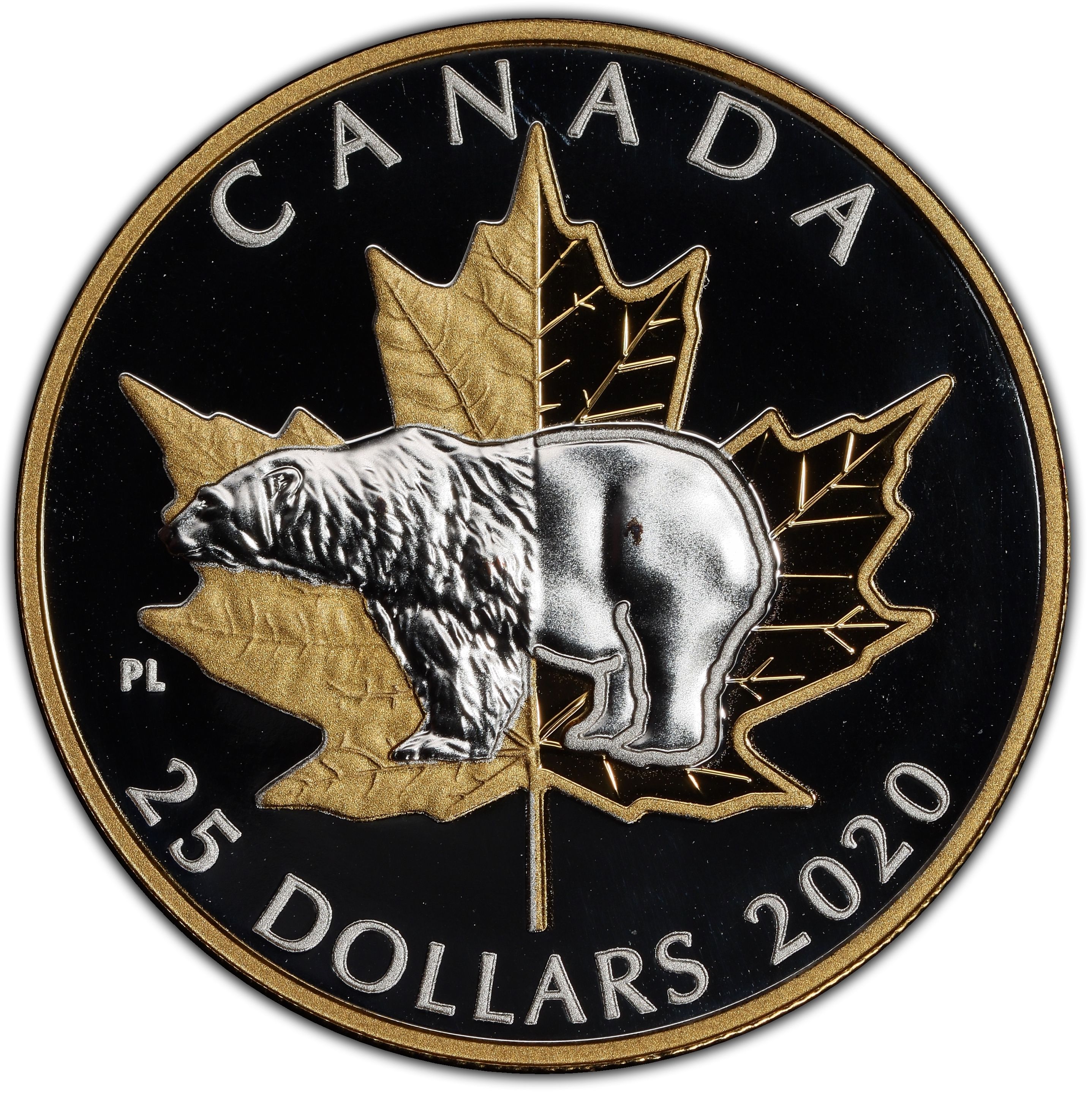 Опис: Дизайн реверсу, створений канадським художником П’єром Ледуком, має велике значення, віддаючи данину поваги еволюції історії Канади через два найвизначніші національні символи. Перехід позначає центр поля, з класичними зображеннями ліворуч, що символізують минуле нації, та більш сучасними версіями праворуч, що символізують сьогодення та майбутнє. Обидва символи виблискують на цій монеті. На першому плані — білий ведмідь, велична тварина, що символізує арктичну дику природу Канади. Його передня половина має детальну текстуру, а задня частина переходить у стилізований силует, що надає цьому канадському символу більш сучасного вигляду. За ним — знаковий кленовий лист, чиї зазубрені краї та глибоко прожилені лопаті є невід'ємною частиною дизайну. Ліва частина має більш природний і реалістичний вигляд, що нагадує реверс улюбленої срібної монети «Кленовий лист» (SML), тоді як права частина робить сильний акцент на симетрії і передає відчуття сили. На реверсі також вигравірувано слово «CANADA», номінал «25 DOLLARS» і рік «2020».