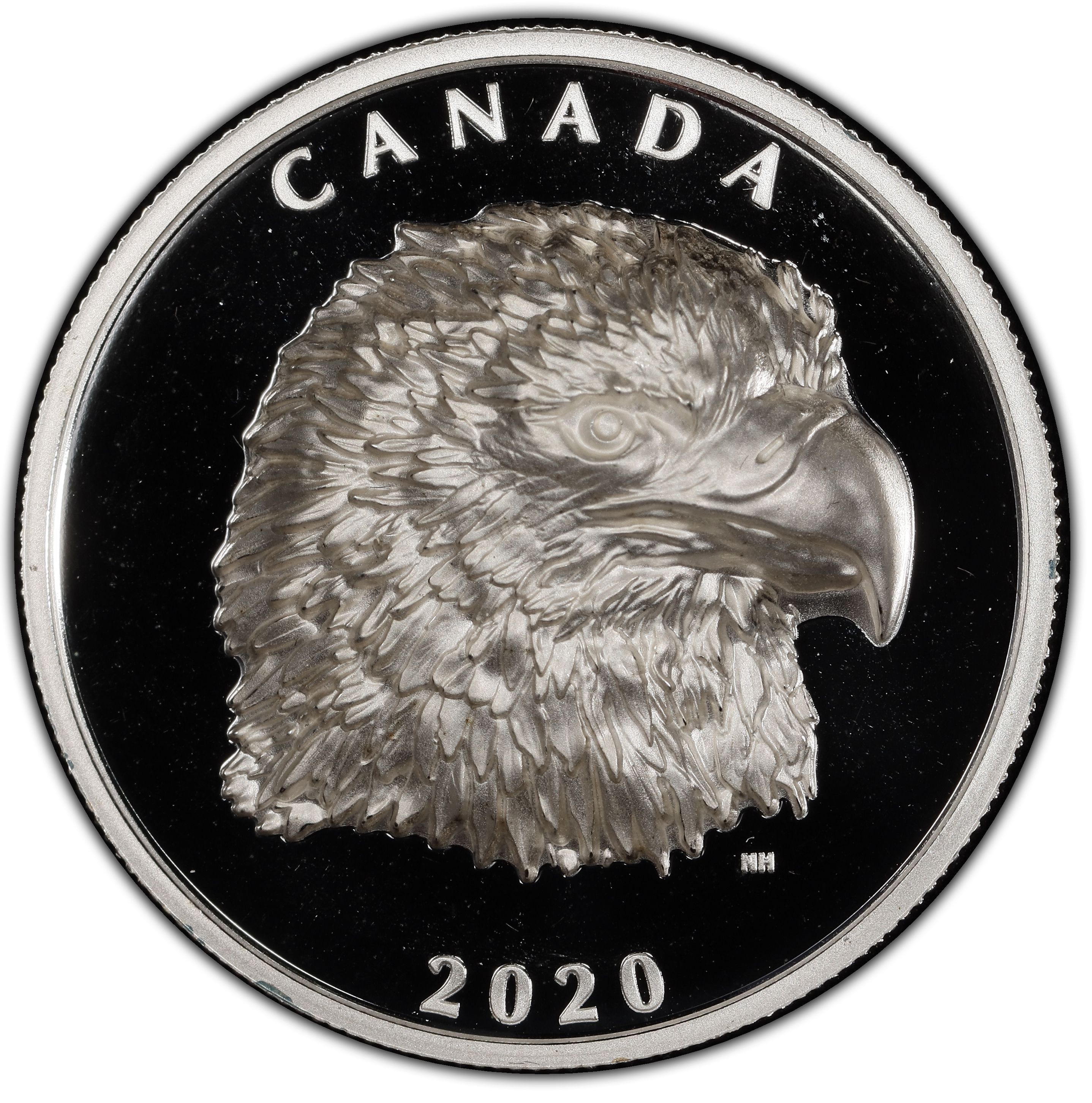 Опис: На реверсі монети канадський художник Ніл Хамелін створив імпозантний портрет білоголового орла, який дивиться вправо через поле монети, з пронизливим поглядом і гачкуватим дзьобом, що є характерними рисами цього величного хижака. Пір'я орла має скуйовджений вигляд з сильно підкресленою формою і текстурою, які зображені з безкомпромісною глибиною і детальністю в надзвичайному високому рельєфі монети. Монета викарбувана з пробним покриттям, яке забезпечує бездоганний дзеркальний блиск на тлі, щоб підкреслити глибину і візуальний ефект гравіювання та надзвичайного високого рельєфу.