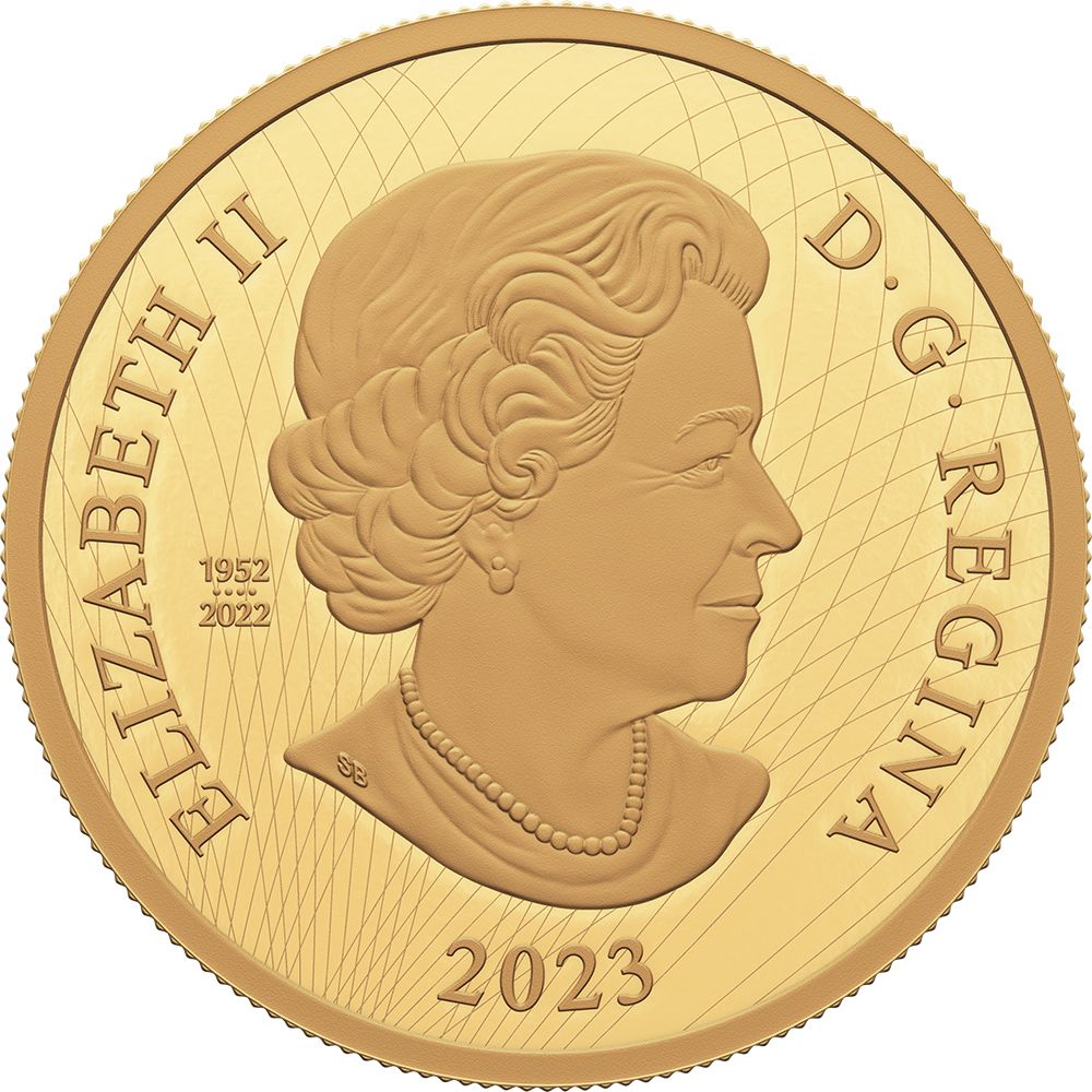Опис: Голова королеви Єлизавети II у віці 77 років, без головного убору, в намисті та сережках, обернена вправо, вліво, подвійні дати «1952» та «2022», розділені чотирма перлинами, що символізують чотири зображення, які прикрашали канадські монети протягом її правління. Фон із візерунком із вигнутих ліній.