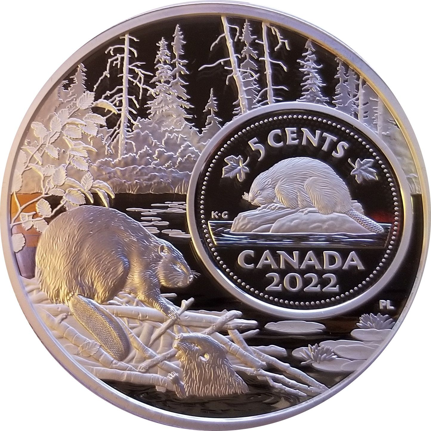 Опис: На звороті поєднано дизайн п'ятицентової монети Кругера Грея з розширеною сценою канадського художника П'єра Ледука; у бореальному лісі Канади знаковий бобер переосмислено як члена колонії, яка активно будує греблю.