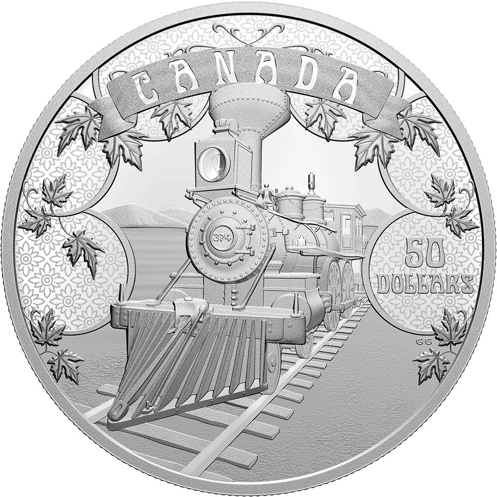 Опис: Зворотний бік монети, розроблений канадським художником Гленом Гріном, підкреслює важливість залізниць в історії Канади та їхню роль у розширенні Конфедерації після 1867 року. Елементи дизайну в стилі ар-нуво оточують зображення локомотива № 374, 4-4-0, який тягнув перший пасажирський поїзд по трансконтинентальній залізниці, що з'єднувала східну і західну частини Канади.