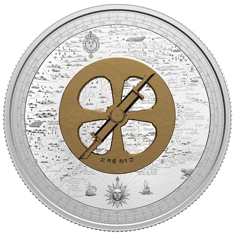 Опис: На зворотному боці монети зображено репродукцію астролябії 17 століття, знайденої поблизу Кобдена, Онтаріо, яка широко асоціюється з французьким дослідником-картографом Самуелем де Шамплейном. Цей навігаційний інструмент, який використовувався для визначення широти, а згодом став скарбом, відлитий зі срібла та бронзи, покритої на цій монеті; на звороті монети вигравірувано репродукцію намальованої від руки Шампленом карти Нової Франції (1632), обрамлену градуйованою шкалою астролябії.