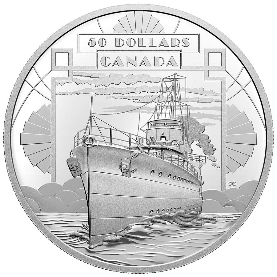 Опис: На звороті монети, розробленої канадським художником Гленом Гріном, зображено символ нового статусу Канади на світовій арені після Першої світової війни (1914-1918). Елементи ар-деко оточують зображення HMCS Saguenay; побудоване в 1931 році, це судно було одним із перших військових кораблів, побудованих для Королівського канадського флоту до його швидкого розширення під час Другої світової війни (1939-1945).
