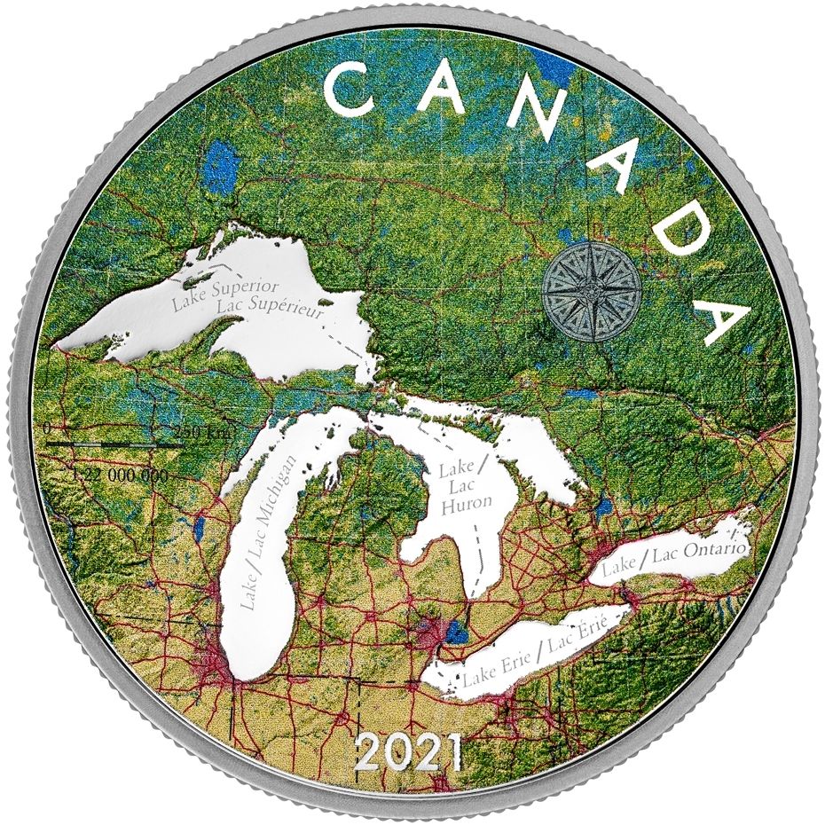 Опис: На зворотному боці монети, розробленому художником і картографом Canadian Geographic Крісом Браклі, зображено чудову карту регіону Великих озер у масштабі «1:22 000 000». Всі п'ять озер (Верхнє, Мічиган, Гурон, Ері та Онтаріо) мають блискучий срібний вигляд завдяки дзеркальному (блискучому) покриттю, а їхні назви зображені матовими елементами. Кожен колір позначає різний тип покриття землі: три відтінки зеленого позначають різні типи лісів, синьо-зелений — водно-болотні угіддя, рожевий — міські території, жовтий — сільськогосподарські угіддя, а червоні лінії позначають дороги. Під словом «CANADA» (праворуч) компасна роза вказує напрямок, а градусні сітки — лінії, що позначають довготу і широту — намальовані на реверсі та вигравірувані лазером на аверсі.