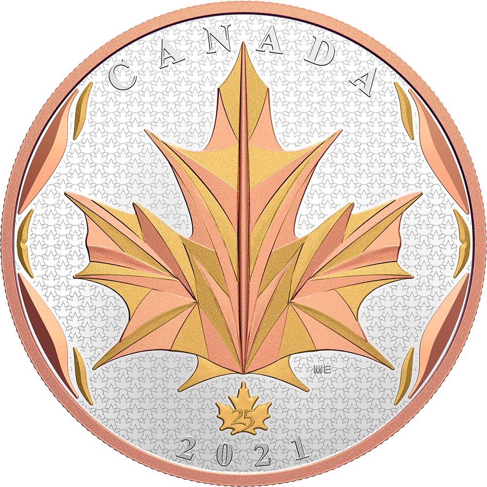 Опис: Окремий лист цукрового клена (Acer saccharum) є центральним елементом цього дизайну канадського художника Метта Еггінка. На тлі лазерного рельєфного візерунка численні грані листа клена окремо покриті жовтим або рожевим золотом для створення високого контрасту та візуальної привабливості. Десять інших геометричних фігур — по одній для кожного виду канадського клена — утворюють часткову рамку, а спеціальний привілейований знак позначає 25-ту річницю (1996-2021) призначення клена офіційним національним деревом-емблемою Канади.