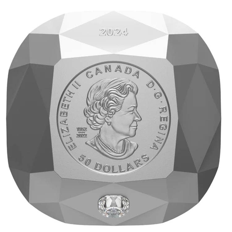 Опис: Унікальна форма та багатогранний дизайн вашої монети є відтворенням запатентованого торгового знака діамантового огранювання від Crossworks Manufacturing, як це видно на діамантах De Beers Ideal. Вбудований в одну з головних граней корони, 0,23 карата. Діамант De Beers Ideal Cushion Cut Ця монета має додаткову особливість, що відображає частину історії гірничої справи Канади: її діамант походить з однієї з найкращих діамантових копалень Канади. На іншій головній грані корони вигравірувано рік «2024», а на найбільшій грані (таблиці) зображено слово «CANADA», номінал «50 DOLLARS» та портрет королеви Єлизавети II у віці 77 років, без головного убору, в намисті та сережках, звернений праворуч. Портрет супроводжується спеціальним маркуванням, що складається з подвійних дат «1952» і «2022», розділених чотирма перлинами, які символізують чотири портрети, що прикрашали канадські монети під час правління Єлизавети II.