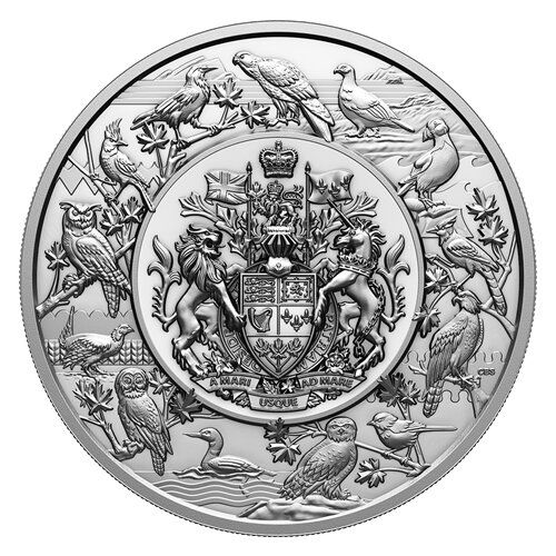 Опис: На реверсі монети зображено нове зображення герба Канади, перемальоване відповідно до круглої форми. Навколо герба розташовані офіційні птахи провінцій і територій Канади, а також геральдичні стилізації та розділові лінії, що символізують ключові географічні особливості, розташовані проти годинникової стрілки, утворюючи зображення Канади із заходу на схід і з півночі на південь.