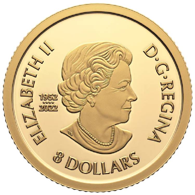 Опис: Голова королеви Єлизавети II у віці 77 років, без головного убору, в намисті та сережках, обернена вправо. Зображення супроводжується спеціальним маркуванням, що складається з подвійних дат «1952» та «2022», розділених чотирма перлинами, які символізують чотири зображення, що прикрашали канадські монети протягом усього правління Єлизавети II.