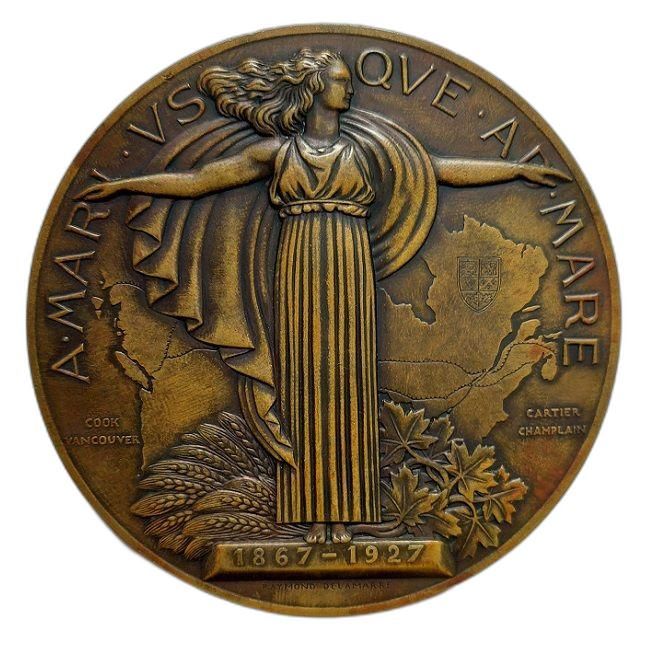 Опис: Алегорична фігура Канади з розпростертими руками стоїть на п'єдесталі з написом «1867-1927». За нею зображено карту Канади, колоски пшениці та кленові листки.