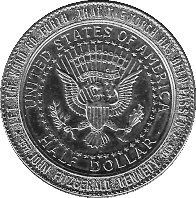 Опис: Реверс монети «Півдолара Кеннеді 1964 року» інкрустований, оточений легендою.