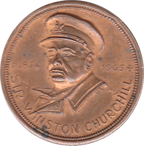 Опис: Зображення Черчилля у військовій формі, що дивиться вправо. Дати праворуч і ліворуч по центру. Легенда йде по нижньому периметру.