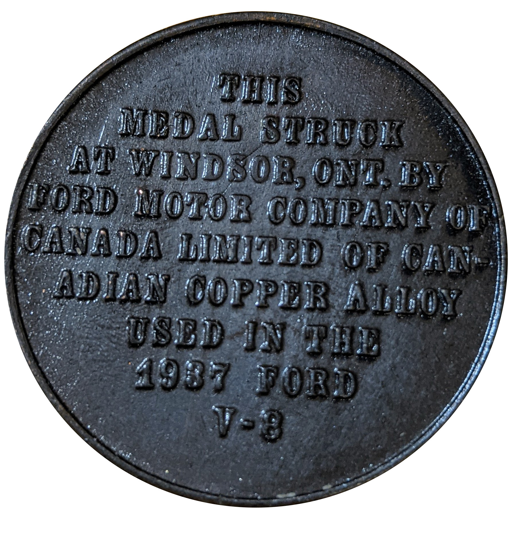 THIS MEDAL STRUCK AT WINDSOR, ONT. BY FORD MOTOR COMPANY OF CANADA LIMITED OF CANADIAN COPPER ALLOY USED IN THE 1937 FORD V-8