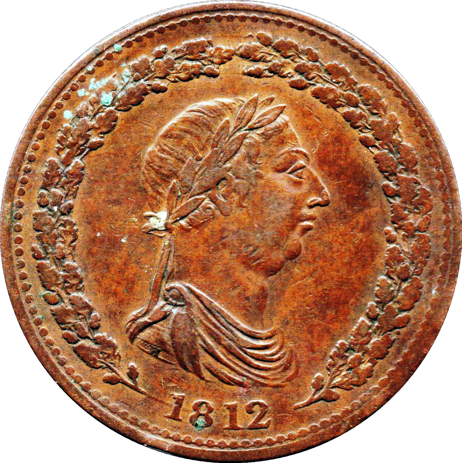 Опис: Лауреат і драпірований бюст Георга III праворуч, H на зрізі; дубові гілки з боків, 1812 знизу; H знаходиться над першою цифрою дати.