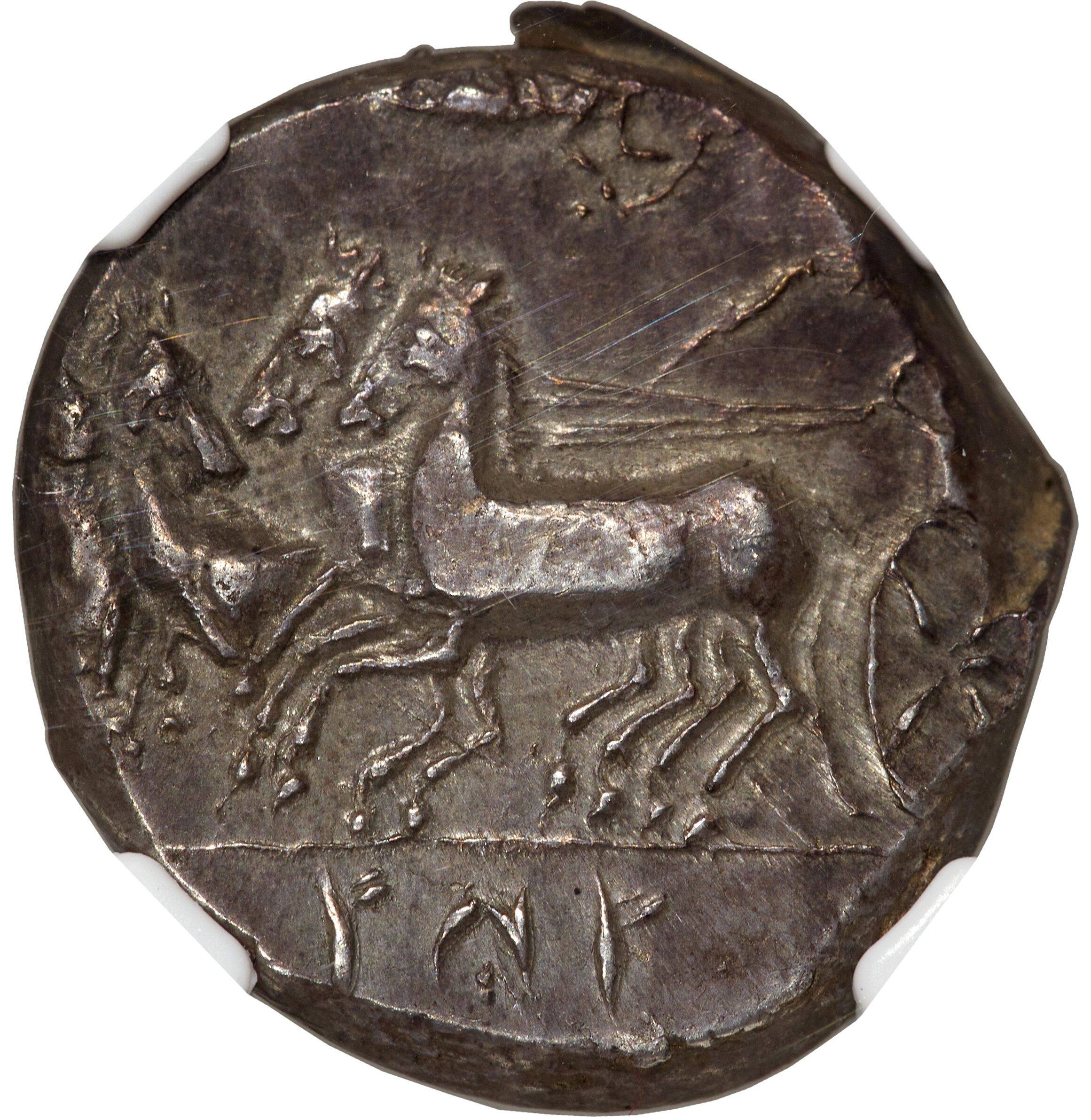 Опис: Чоловік-водій колісниці, що їде на квадризі ліворуч, з кентроном у лівій руці та віжками в правій; Ніка, що летить праворуч, вінчає водія, SYS (пунічний) в екзергу.