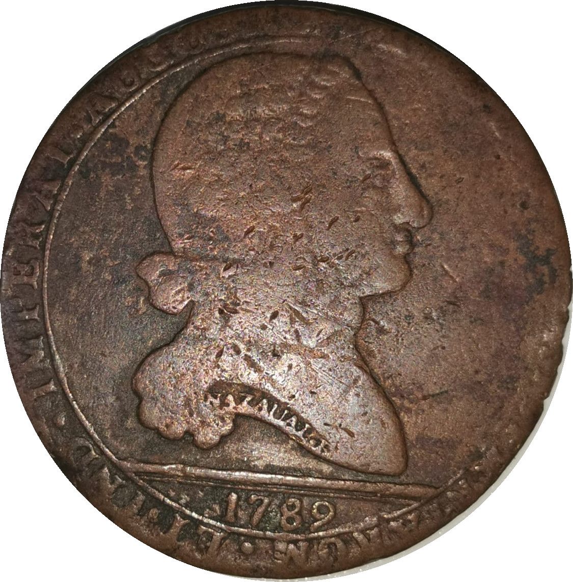 Опис: Погруддя Карла IV праворуч із написом «1789» у нижній частині, все в межах внутрішнього кола; підпис гравера «Nazaual F.».