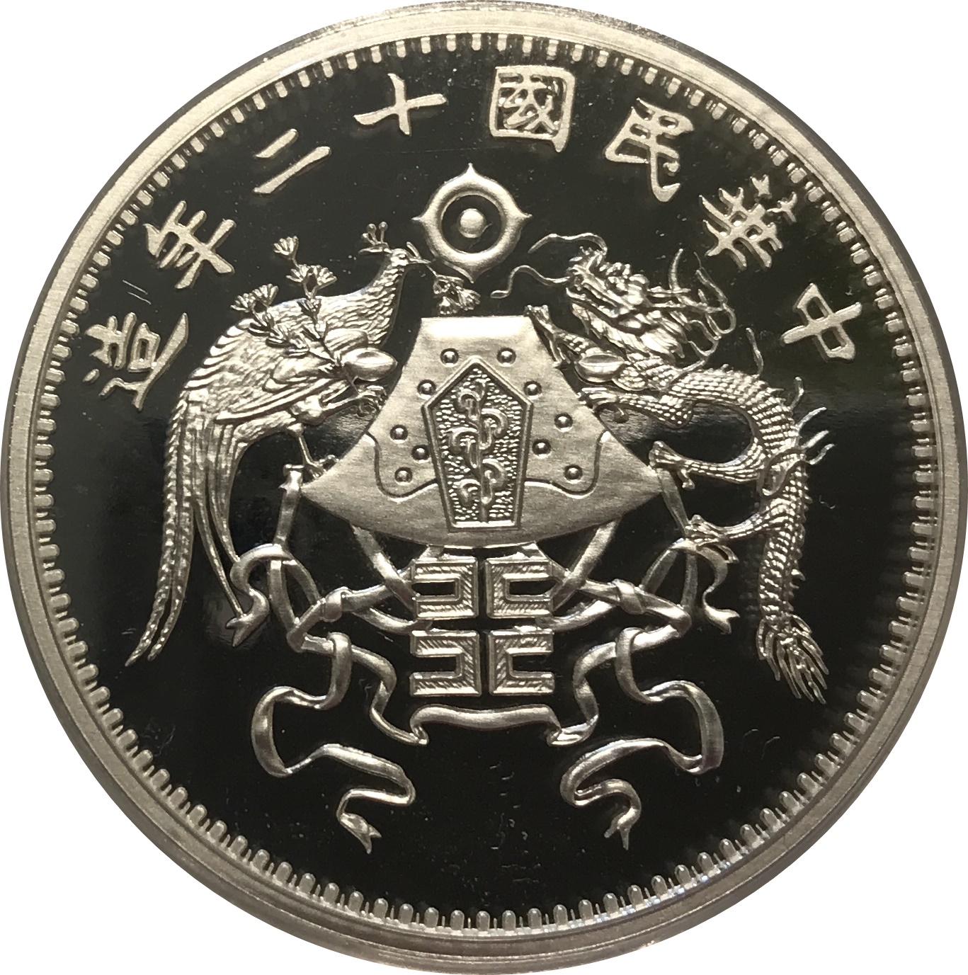 Опис: Зображує дракона та фенікса разом із національним гербом «Дванадцять символів», а також напис китайськими ієрогліфами, який читається зліва направо: «Створено в 12-му році Республіки Китай».