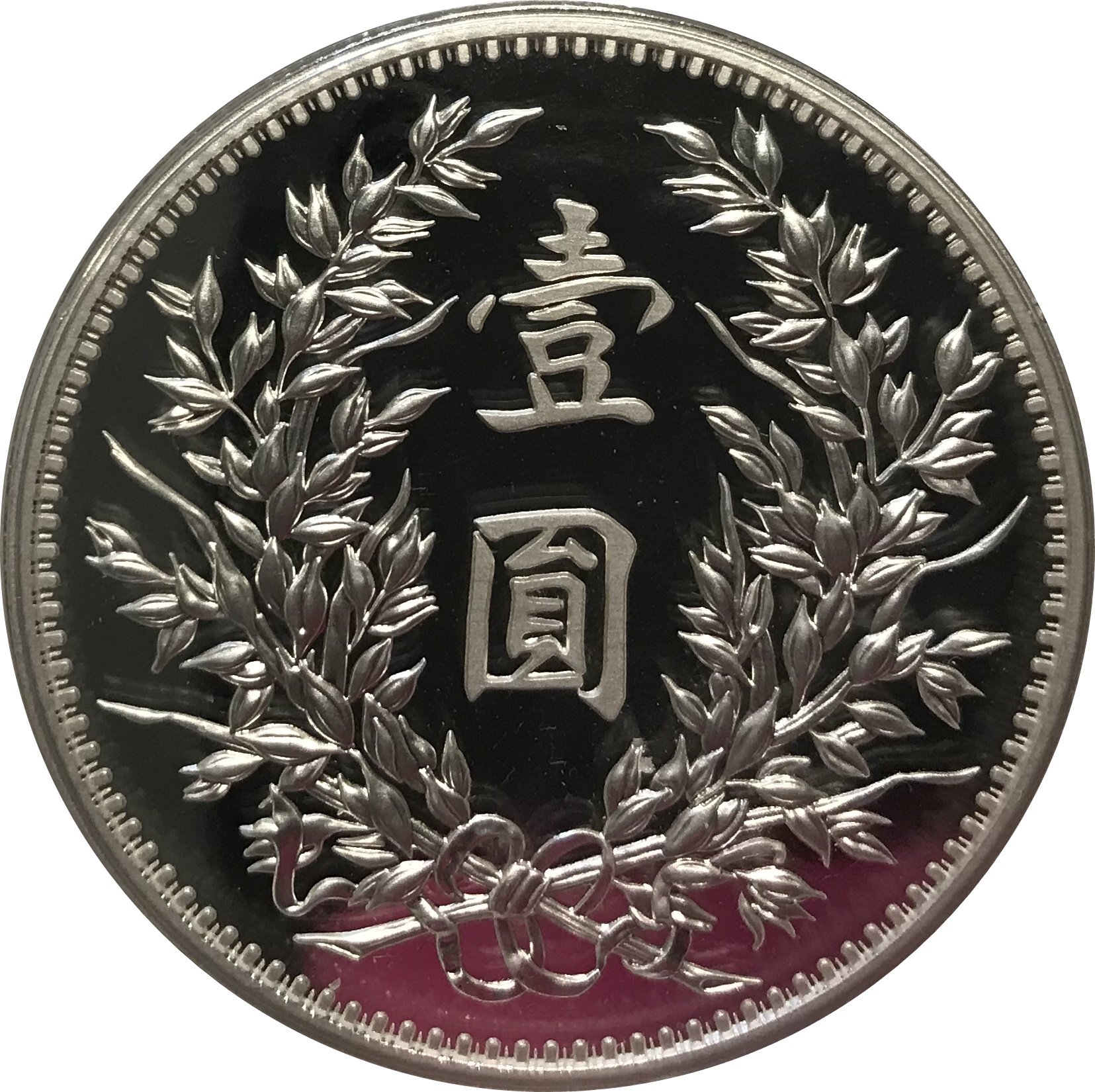 Опис: На монеті зображено вінок із зерна, всередині якого китайськими ієрогліфами написано «Один долар».