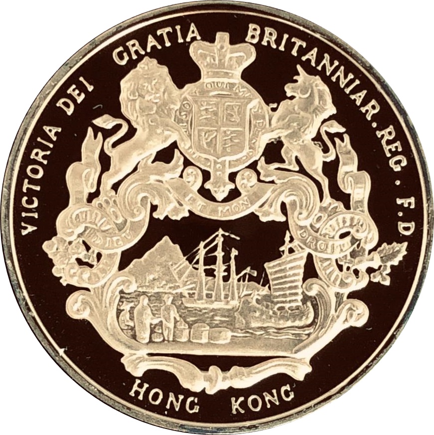 Опис: На табличці під гербом зображено сучасний вигляд Гонконгу з англійськими та китайськими торговими суднами в гавані.