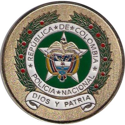 Опис: Герб Національної поліції Колумбії в зеленому колі, оточеному білим кільцем з шифром і зеленим вінком.