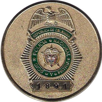 Опис: Герб Національної поліції Колумбії, оточений зеленим кільцем із шифром. Орел, що тримає шифр «Republica de Colombia» на зеленому тлі зверху. Шифр «1891» знизу (можливо, номер члена).