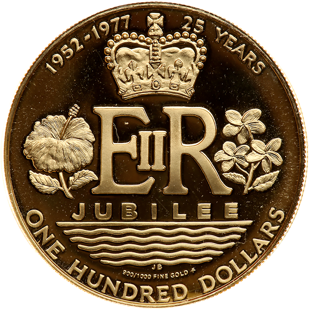 100 доларів — Єлизавета II (Срібний ювілей) 1977 – 1977 Острови Кука