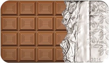Опис: Повнокольорове факсиміле плитки молочного шоколаду, з окремими квадратиками та частково знятою внутрішньою фольговою обгорткою. Дата вказана у правому нижньому куті.