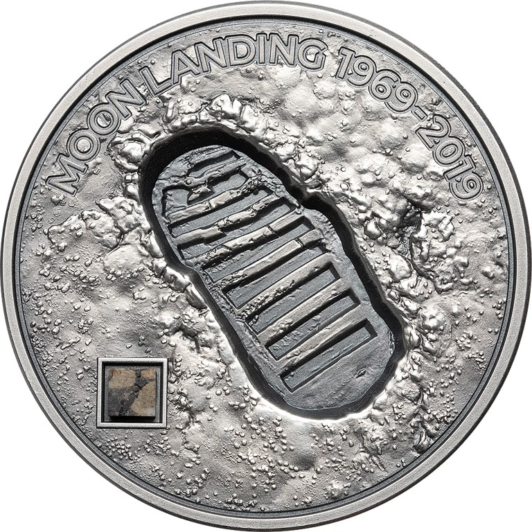 Опис: Зображення сліду першого людини, що ступила на Місяць, та вставка із справжнього місячного метеорита.