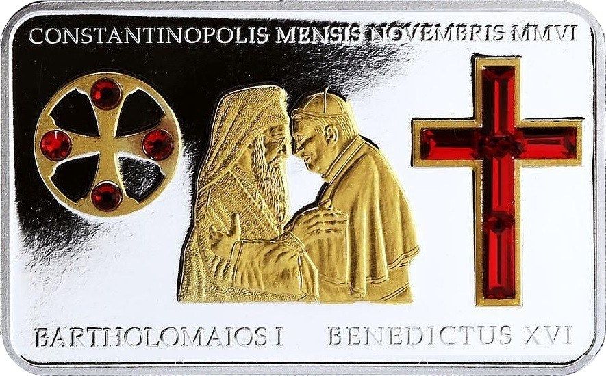 Опис: Позолочені бюсти архієпископа Варфоломія I Константинопольського, що вітає Папу Римського Бенедикта XVI, між грецьким хрестом з чотирма круглими червоними кристалами та латинським хрестом з п'яти червоних кристалів.