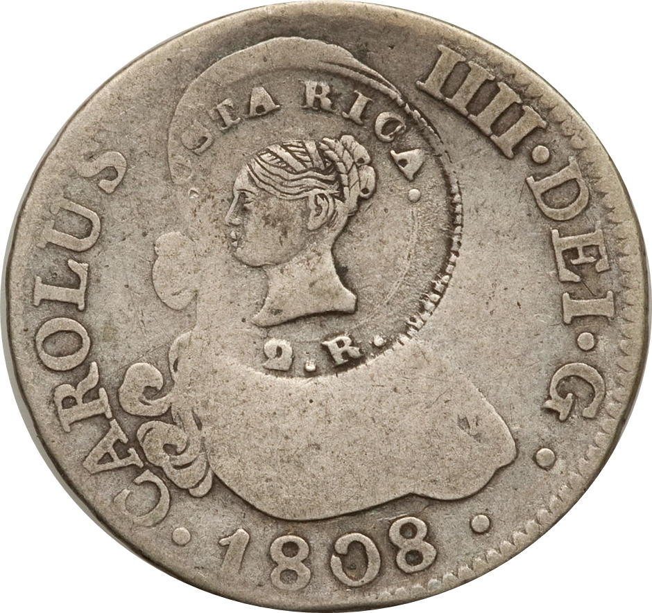 2 реале (тип III контрштамп) 1845 – 1845 Коста-Ріка