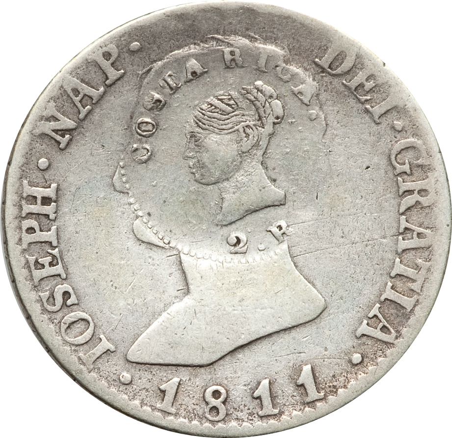 2 реале (тип III контрштамп) 1845 – 1845 Коста-Ріка