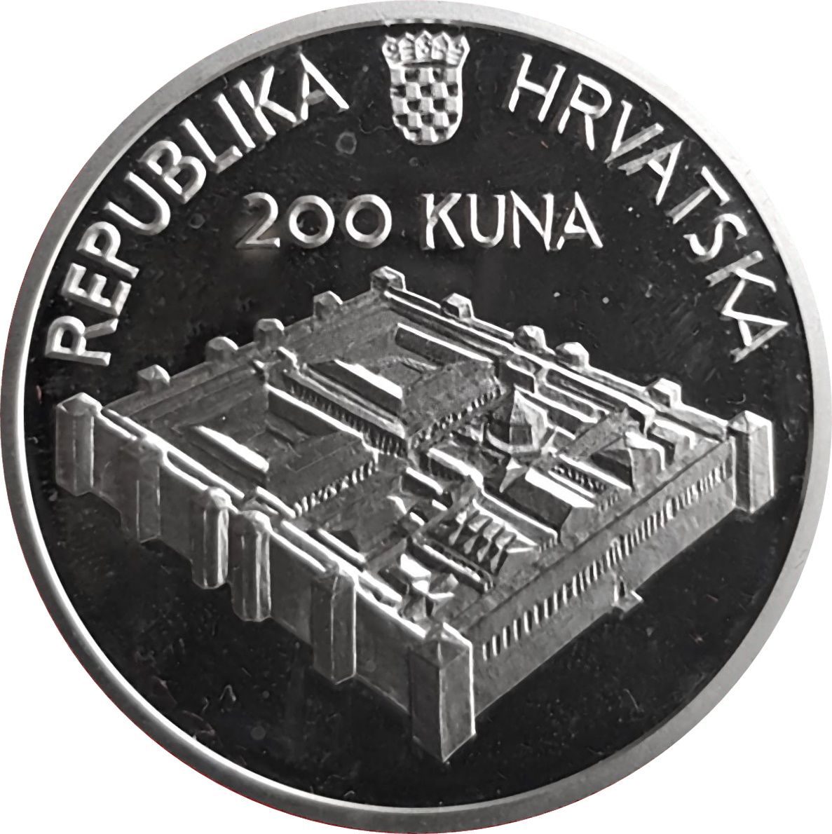 Опис: Ескіз палацу Діоклетіана, виконаний французьким архітектором Ернестом Ебраром на основі реконструкції його зовнішнього вигляду. Над палацом вказано номінальну вартість «200 KUNA», а у верхній половині півкругового тексту «REPUBLIKA HRVATSKA» з національним гербом, розміщеним між цими двома словами.