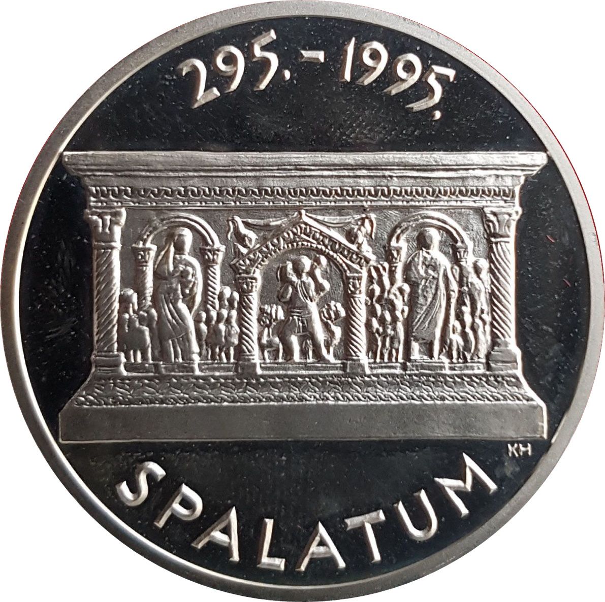 Опис: У центрі знаходиться скриня саркофага (сьогодні зберігається в Археологічному музеї в Спліті) з рельєфним зображенням Доброго Пастиря на передній частині центральної едікули та фігурами померлих, двох подружжя, ліворуч і праворуч. Саркофаг був знайдений в середині 19 століття на кладовищі Солін Манастіріне і датується другим десятиліттям 4 століття. На краю монети розміщено круговий напис «SPALATUM» і «295. – 1995.». Спалатум згадується в джерелах як назва невеликого поселення на місці палацу Діоклетіана. Підпис «KH» дизайнера Казіміра Храсте.