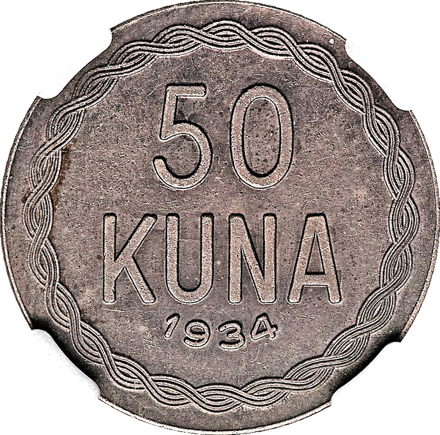 Опис: По всьому краю монети зображено хорватський орнамент із трьома стрічками. У центральній частині монети вказано її номінал (50), під ним — слово «KUNA», а внизу — рік карбування (1934).