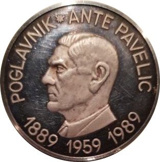 Опис: У центральній частині монети зображено бюст Анте Павеліча, звернений ліворуч. По краю монети написано POGLAVNIK ANTE PAVELIĆ. По нижньому краю монети написано 1889 1959 1989 (роки народження і смерті Павеліча та рік карбування).