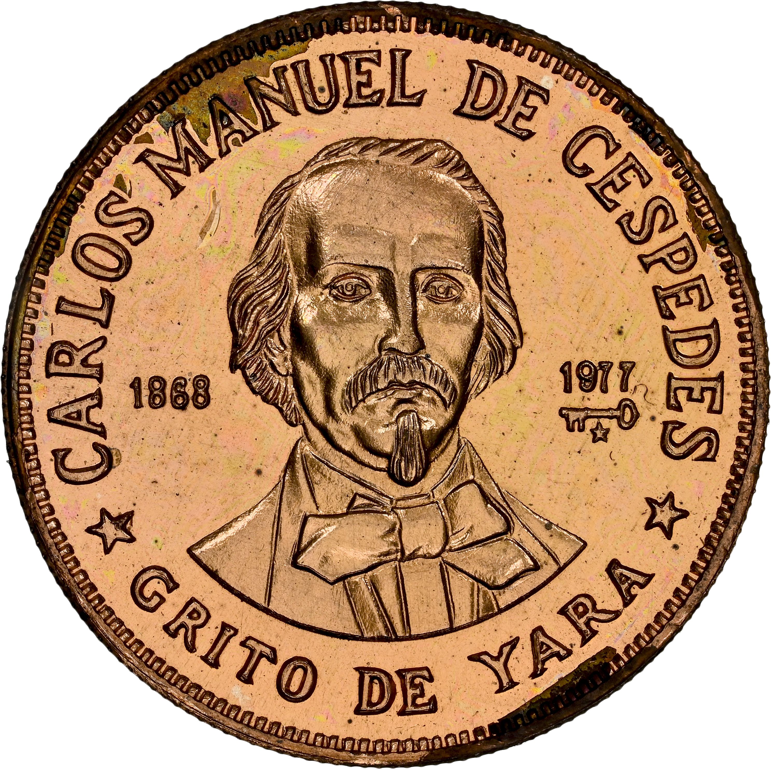Опис: Карлос Мануель Де Сеспедес, зображений анфас, дата події ліворуч, дата випуску та знак монетного двору праворуч; кругові написи: ім'я особи зверху, назва події знизу.