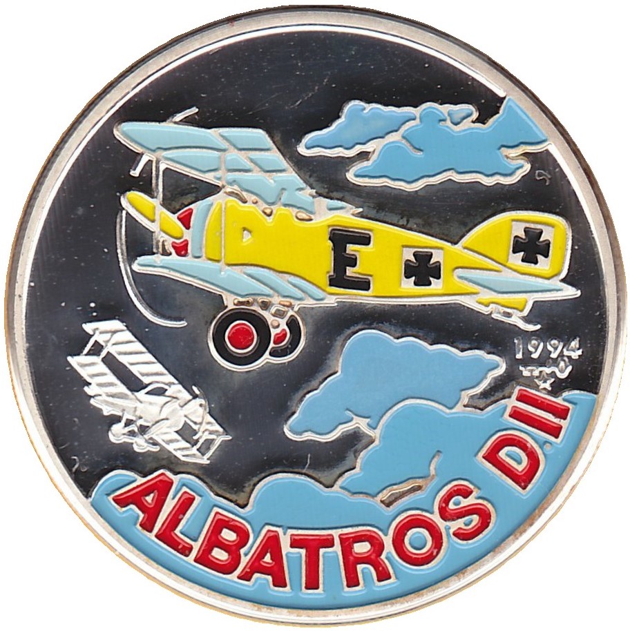 Опис: Багатоколірний Albatros D II в польоті, хмари та інший біплан на тлі, назва літака внизу, знак монетного двору та дата випуску праворуч.