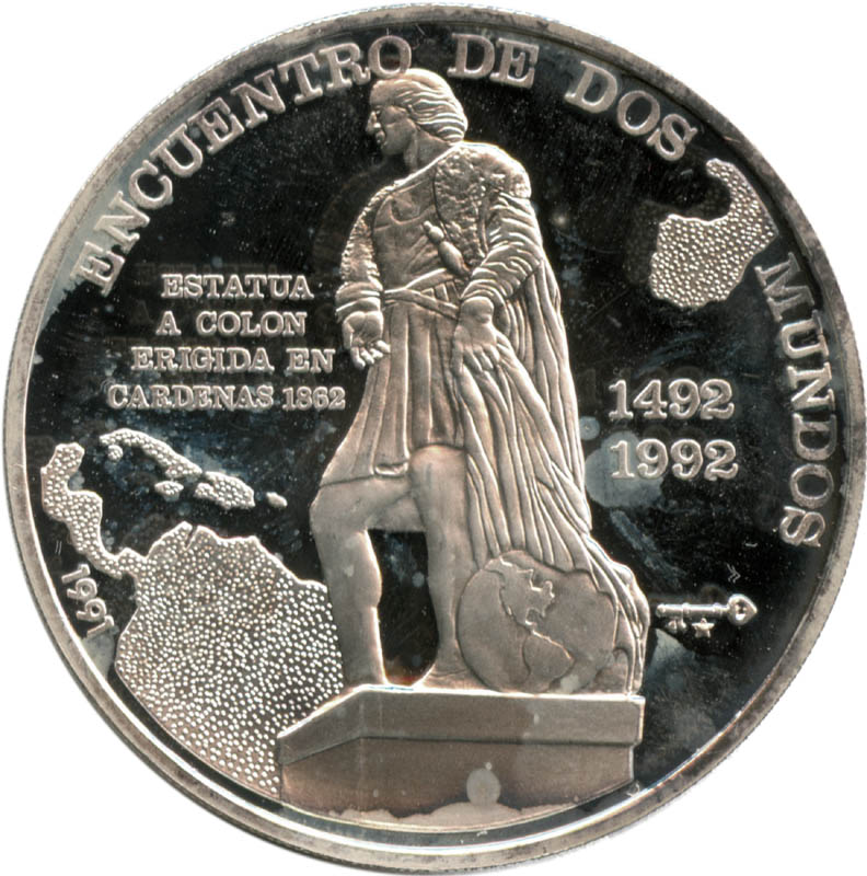 Опис: Статуя Колумба в Карденасі; на тлі силует Іспанії вгорі праворуч, Куба та Центральна і Південна Америка внизу ліворуч. Опис ліворуч, дати праворуч, знак монетного двору внизу праворуч.
