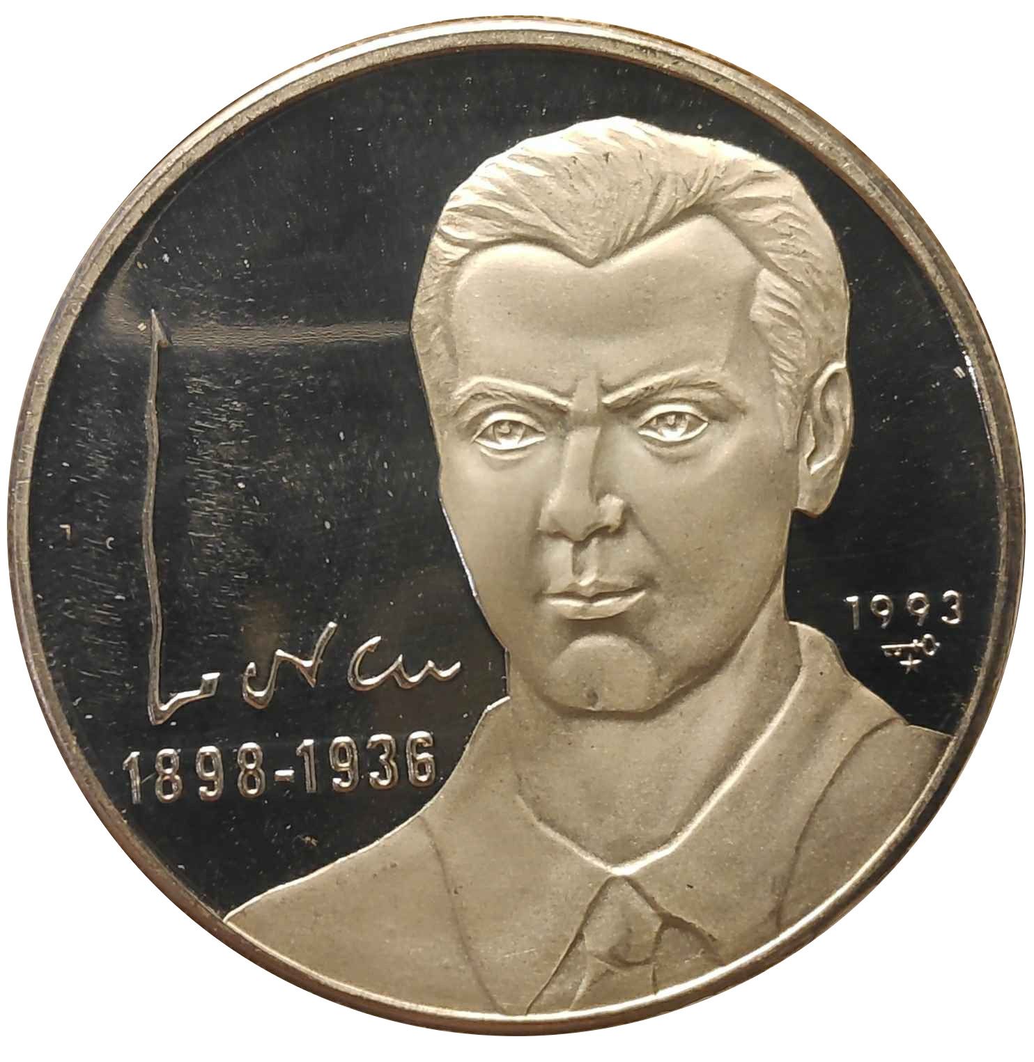 Опис: Федеріко Гарсія Лорка, зображений анфас, підпис ліворуч, дати життя нижче, рік випуску та знак монетного двору праворуч.