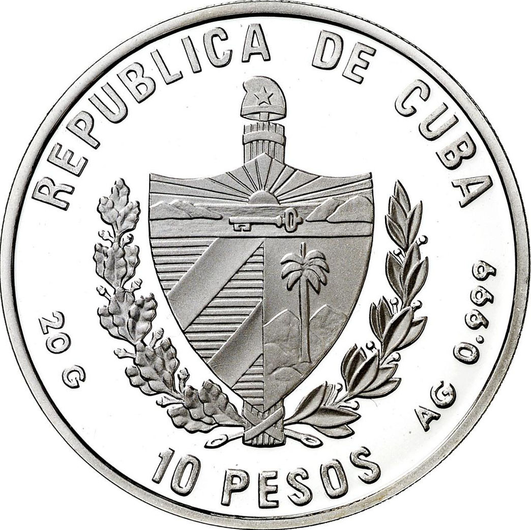Опис: Кубинський герб, назва країни у вигляді вигнутої легенди зверху, номінал знизу, вага та проба з боків.