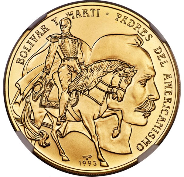Опис: Сімон Болівар верхи, обличчя повернуте на 3/4 вліво; на тлі голова Хосе Марті Напис навколо, дата на екзергу