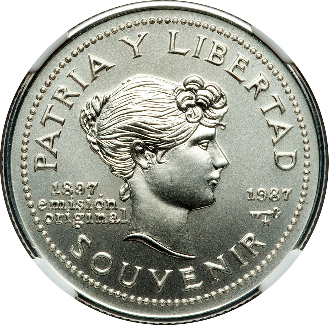 Опис: Портрет Леонор Моліни, що символізує Республіку, вперше з'явився на кубинській монеті. Девіз на вигнутій легенді вгорі, «emisión original» і пам'ятна дата зліва, знак монетного двору і поточна дата випуску праворуч, «SOUVENIR» внизу. Ряд перлин біля краю.