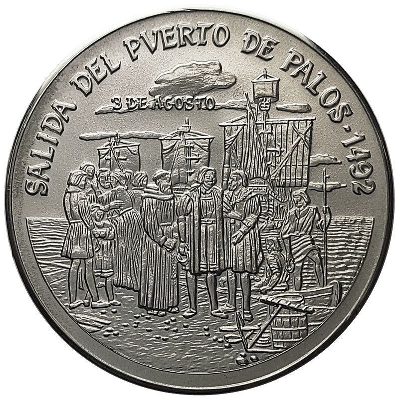 Опис: Сцена, що зображує відплиття Колумба з порту Палос, звідки вирушили іспанські першовідкривачі. Зверху та з боків — вигнутий напис із назвою події та датами. Колумб у оточенні своєї команди, на тлі — вітрильні кораблі. Плачуча жінка прощається зі своїм чоловіком, місіонером, та іншими.