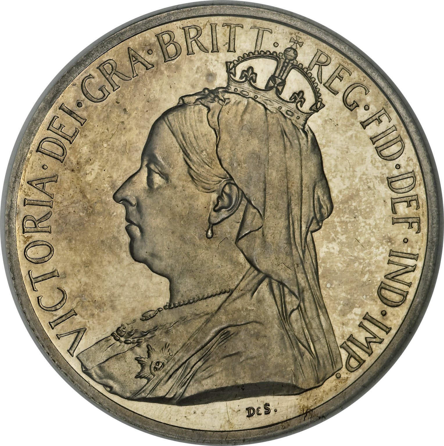 Опис: Коронований і завуальований бюст ліворуч. DeS (=De Saulles) у рельєфі внизу і в колі напис: VICTORIA•DEI•GRA•BRITT•REG•FID•DEF•IND•IMP•