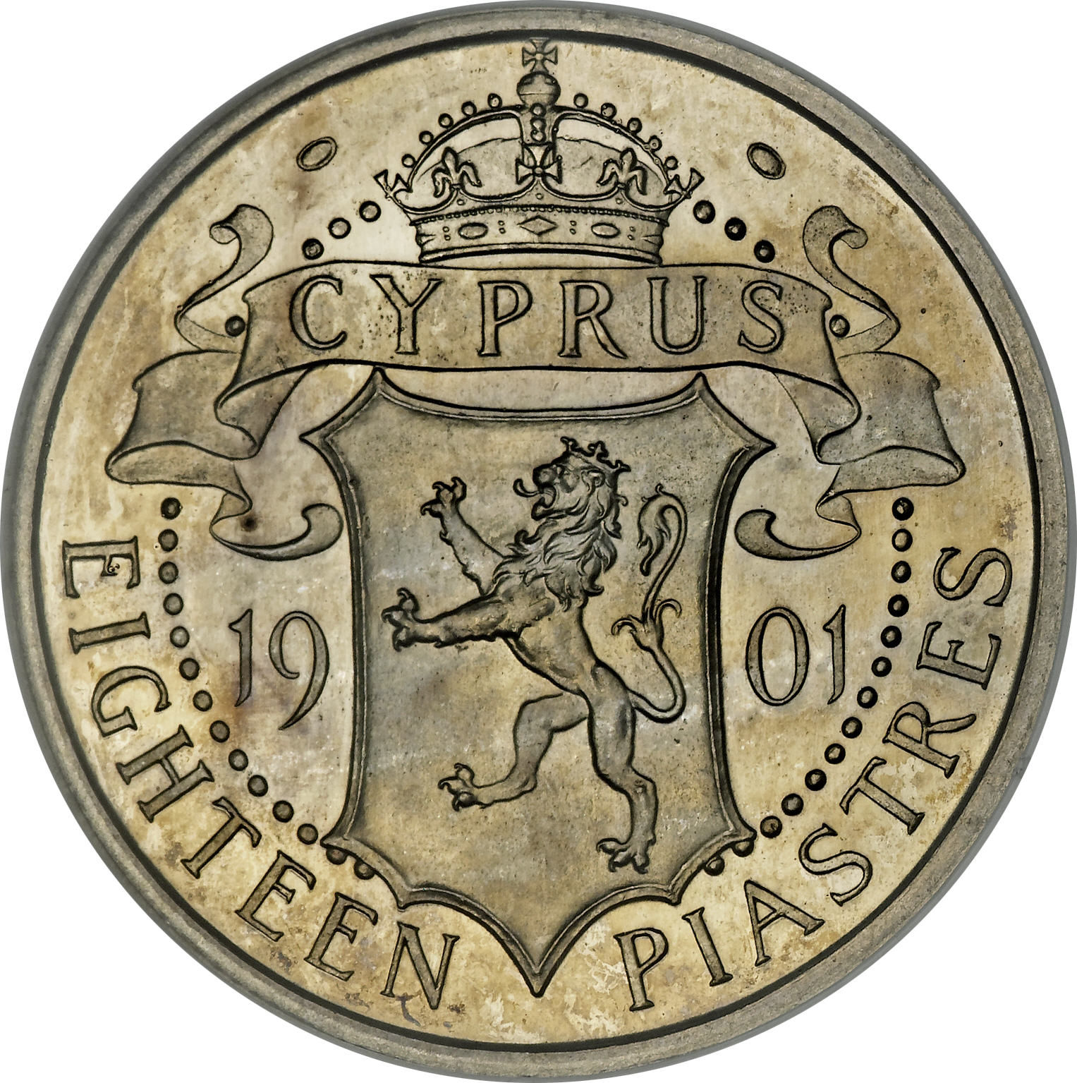 Опис: Коронований гербовий щит із левом Лузіньяном, який розділяє дату 1901 рік. Корона спирається на сувій з написом CYPRUS, а номінал вказано словами (EIGHTEEN PIASTRES) по нижньому краю малюнка.