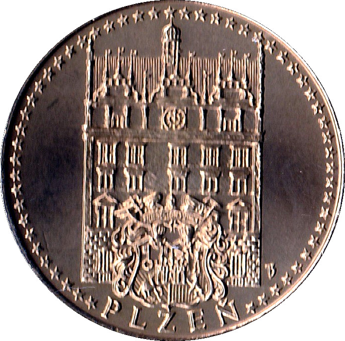 Опис: На аверсі зображено ратушу Пльзень у стилі ренесансу, фасад якої прикрашений у стилі неоренесансу, створеному під час капітального ремонту будівлі в 1910 році.