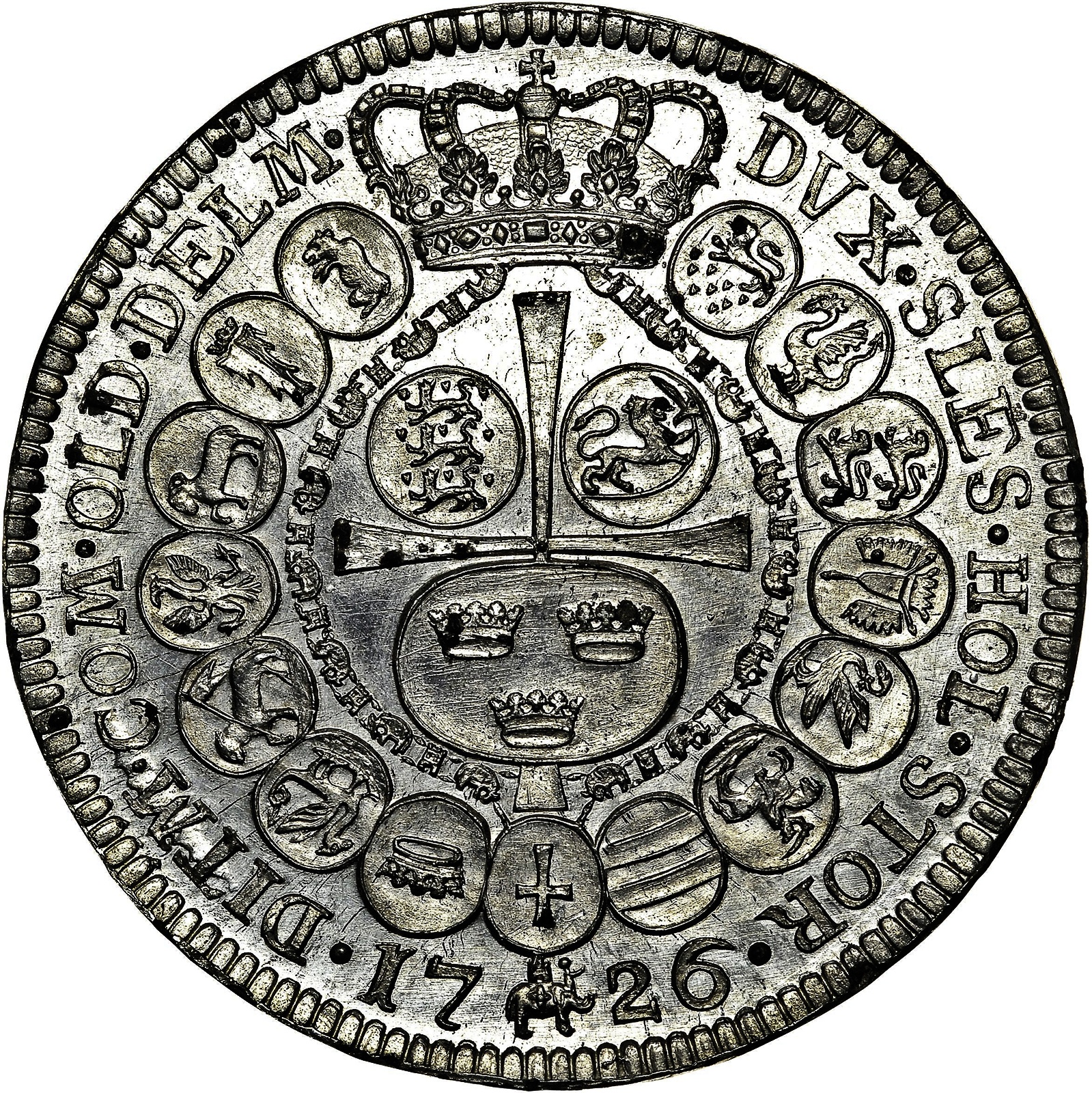 Опис: Три округлі герби над невеликим хрестом (герби Данії, Швеції та Норвегії) увінчані орденським коміром та колом із 15 круглих щитів територій та володінь Данії. Дата внизу розділена підвіскою Ордена Слона.